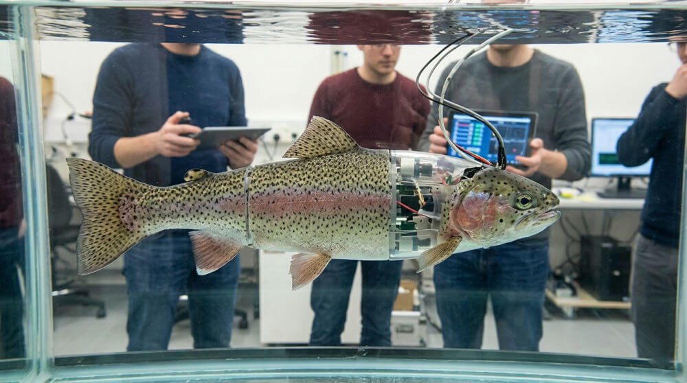 Le LS2N (Laboratoire des sciences du numérique de Nantes) développe un dispositif biomimétique de robot-truite capable d’interagir avec les bancs de poissons. L’objectif est d’influencer et de synchroniser leurs déplacements grâce à des algorithmes de coordination collective, selon une véritable “chorégraphie énergétique”, afin d’augmenter le rendement global du système.