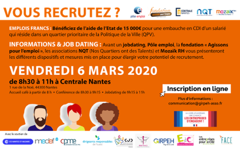 With the Fondation Agissons pour l'Emploi, Centrale Nantes, Nos Quartiers ont du Talent, and Mozaïk RH. At the end of the presentation, a jobdating session will be held to meet potential job seekers.